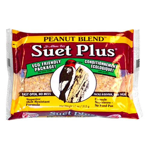 Peanut Blend Suet. Melt-resistant design so you can use this suet all year round, even in the heat of summer. Easy-opening packaging requires no scissors and eliminates the greasy handling mess. Plus, the packaging is recyclable and uses 80% less packaging than traditional suet feeders in trays. Attracts: Woodpeckers, particularly Downy, Hairy, and Red-bellied Woodpeckers, Chickadees, Nuthatches, Wrens and more.